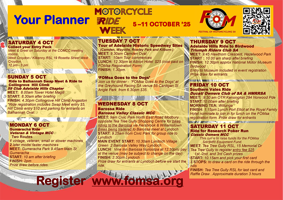 FOMsa events will take you on some of the best roads around South Australia. During the Festival in October we have rides covering the Barossa Valley, the Adelaide Hills, the Southern Vales & Fleurier Peninsula the Mid North and Murray Lands. If you can join us you wont regret the experience!